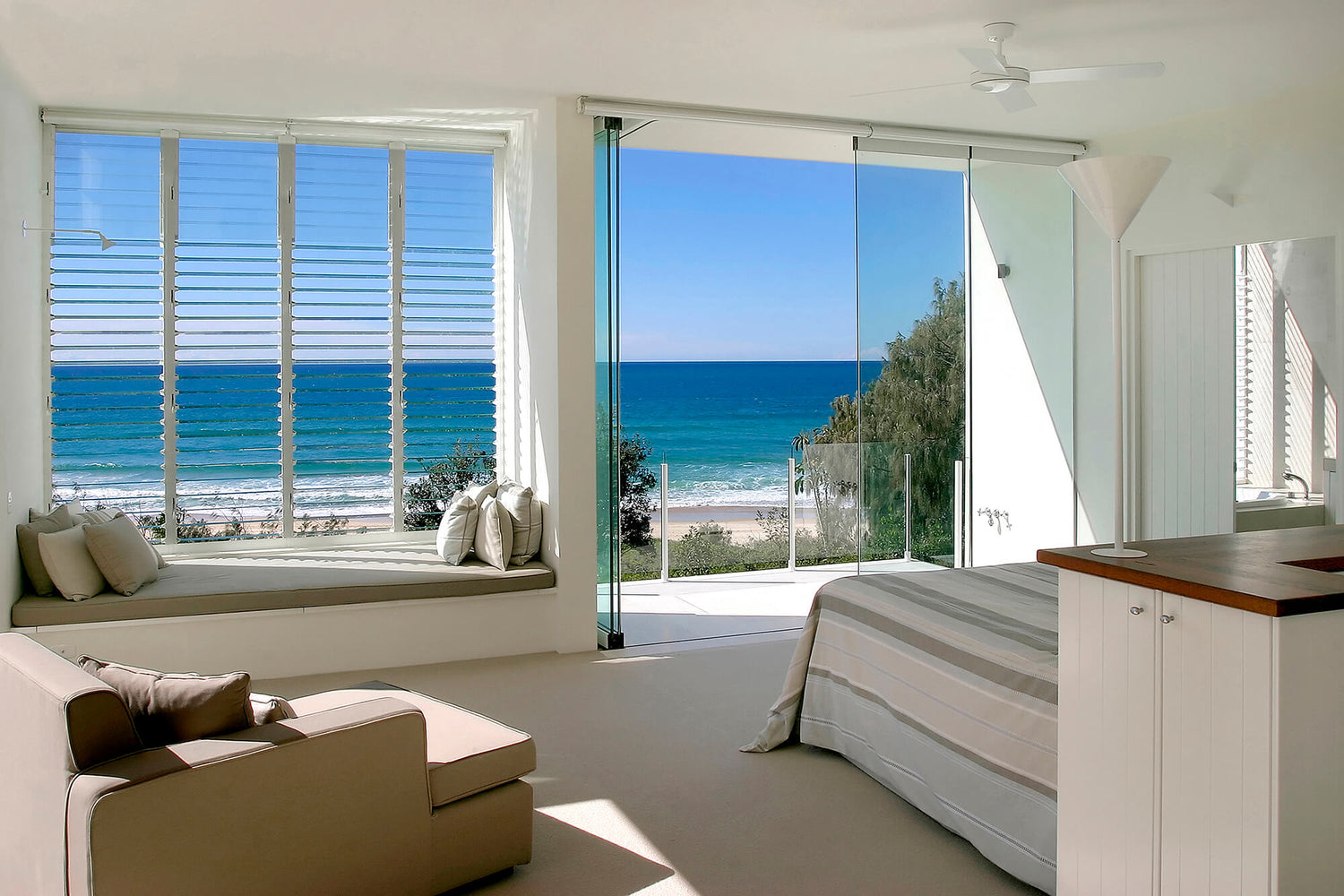Altair Louvres can help keep a bedroom comfortable. Installing louvres next to sliding doors can connect you to your outdoor surroundings even when doors are closed. Mix and swap louvre blades depending on the season. Aluminium or timber blades can achieve shading and privacy while glass blades maximise views.
